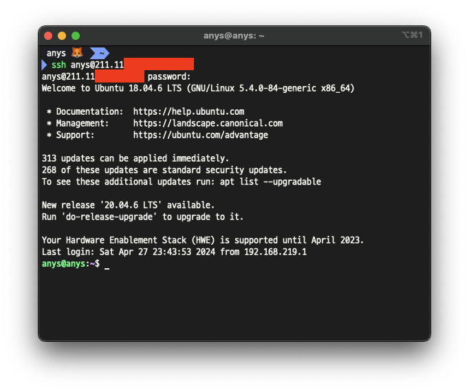 5. 다음과 같이 ssh 접속이 되면 성공입니다!